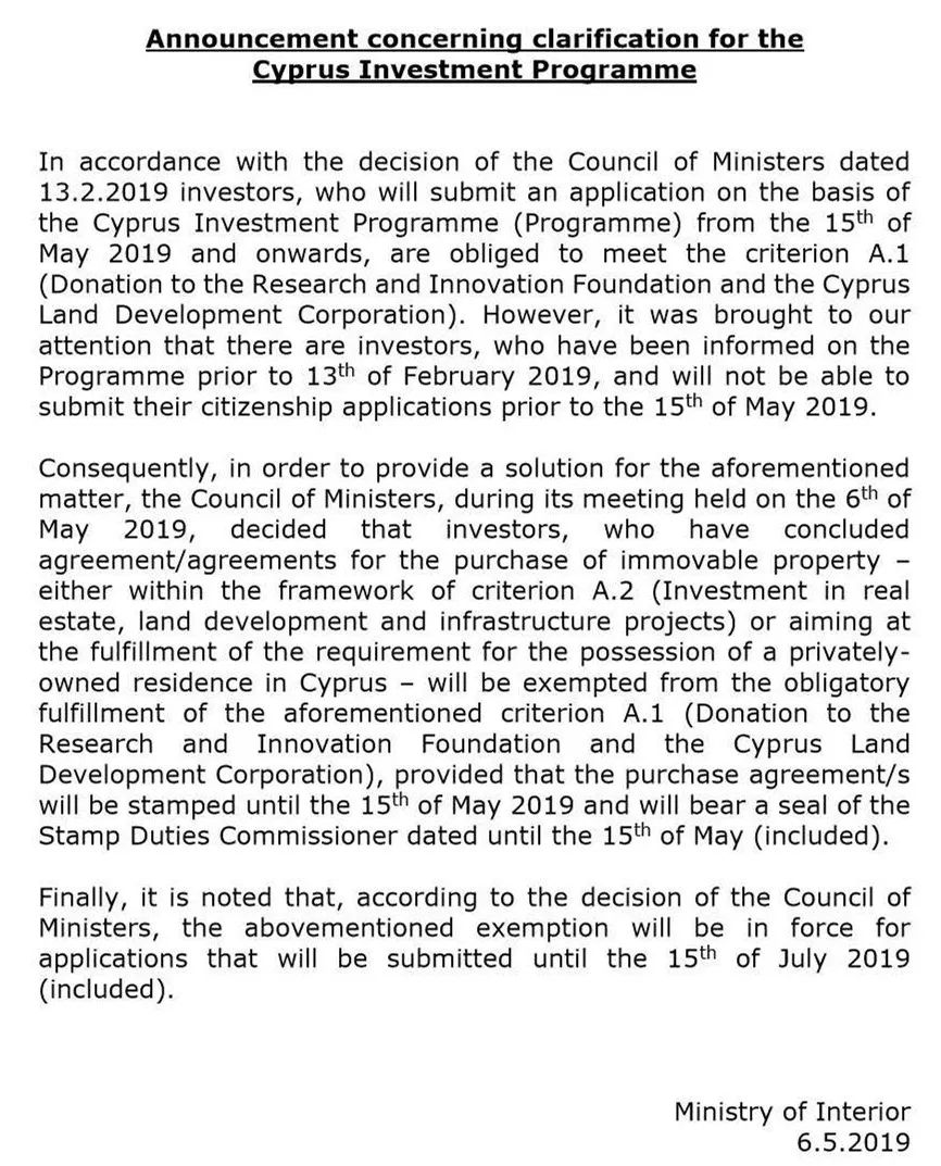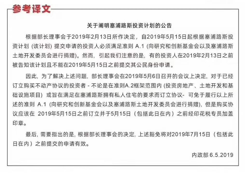 之前,在塞浦路斯投资入籍项目变政的最后20天里,传来了好消息:5月15日后,针对5.15前完成购房手续,并且买卖合同在土地局完成注册备案的,申请文件递交仍可按照旧例宽延30日......