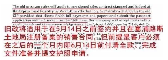 也就是说:现在,申请人只需要在5月14日(含)之前交付定金,完成购房手续,并将有效合同在塞岛土地注册处备案即可。申请人将拥有一个月的缓冲时间,只要在6月14日(含)前付清全款并完成文件准备、递交护照申请,即可享受旧政。