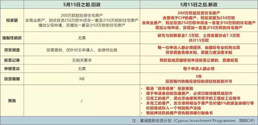 众所周知,欧盟委员会年前呼吁欧盟各国收紧移民政策,谨慎对待投资入籍,给予了欧盟境内有投资入籍计划的几个国家空前的高压。迫于压力,此前,塞浦路斯内阁已经通过了此修正案,提高了投资入籍门槛,并将新政定于2019年5月15日后执行!届时,购房款200万欧元将增加向政府捐款15万欧元等,而相应的背景审查与资金来源调查也更加严格。