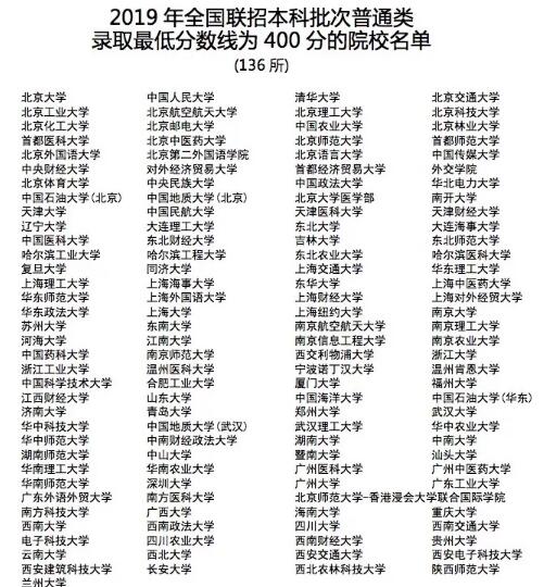 近日,全国联招办公室公布了2019年普通高等学校联合招收华侨港澳台学生录取最低分数线。艺术、体育类院校录取分数为200分,普通院校录取分数为300分。多数985、211重点大学的录取分数线为400分,清华北大这类顶尖学府也在400分的列表中。