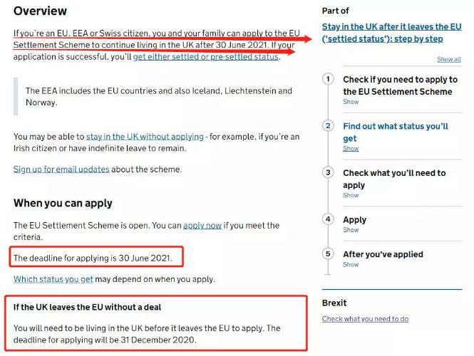 英国移民局官网显示,目前《欧盟永居方案》已开放申请,截止日期是2021年6月30日。但若英国无协议脱欧,则《欧盟永居方案》的申请截止日期为2020年12月30日。