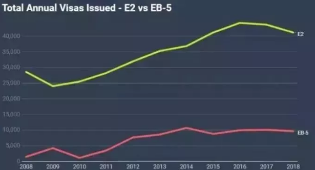 过去10年间,有7.4万人通过EB-5项目登陆美国,有35万人通过E-2签证登陆美国。